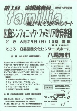 | 第2回 | 2007年 | 6月23日(土) | 安芸区民文化センター | ハレルヤ! 交響組曲「パイレーツ・オブ・カリビアン」 青い水平線 ラプソディ・イン・ブルー(ピアノ:宮田秀美) スカイ・ハイ アンダー・ザ・シー メモリー ジャパニーズ・グラフィティⅩⅡ 松本零士メドレー マーチ「ブルー・スカイ」(アンコール) エル・クンバン・チェロ(アンコール) ラデツキー行進曲(アンコール) |